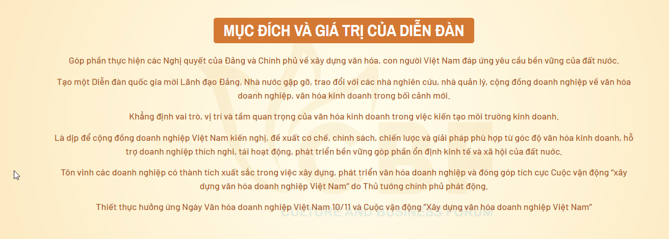 Tôn vinh các doanh nghiệp có thành tích xuất sắc trong việc xây dựng, phát triển văn hóa doanh nghiệp và đóng góp tích cực Cuộc vận động “xây dựng văn hóa doanh nghiệp Việt Nam” do Thủ tướng chính phủ phát động.